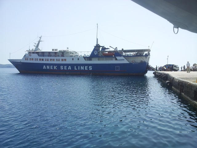 The ferry which links all the island of the Dodecanese came in to Skala.It’s not like in Scotland where the passengers and vehicles have separate exits. It’s a jumble of people and vehicles. On the shore you are met by people with rooms to rent as well as the taxi offers.